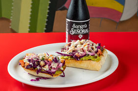 Mexican Sandwich. Filling of your choice, pickled red onions, pico de gallo, guacamole, beans, red cabbage, potato tots & red salsa on the side. Choose any of our delicious fillings from Tinga, Carnitas, Chorizo, Cochinita Pibil, Baja Fish (+$1), Beef (+$1), Veggie, and Chorizo with Eggs.